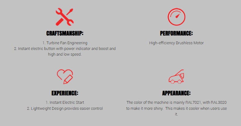 Návrh čepele ventilátoru: Aerodynamický design čepele ventilátoru zajišťuje efektivní vedení proudění vzduchu, maximalizuje výkon foukání listů a zlepšuje účinek čištění.