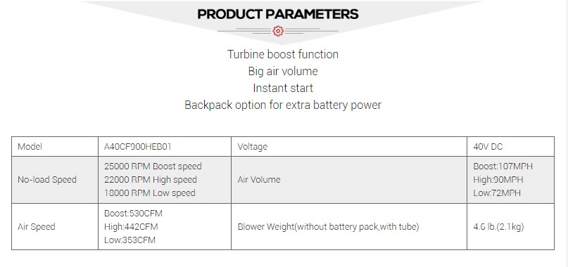 Technologie motoru bez kartáčovače: Funkce turbodmychadla lithiové baterie listů přijímá efektivní bezhrubé motorické technologii, která pohání turbo ventilátor vysokou rychlostí a vytváří silný proudění vzduchu.