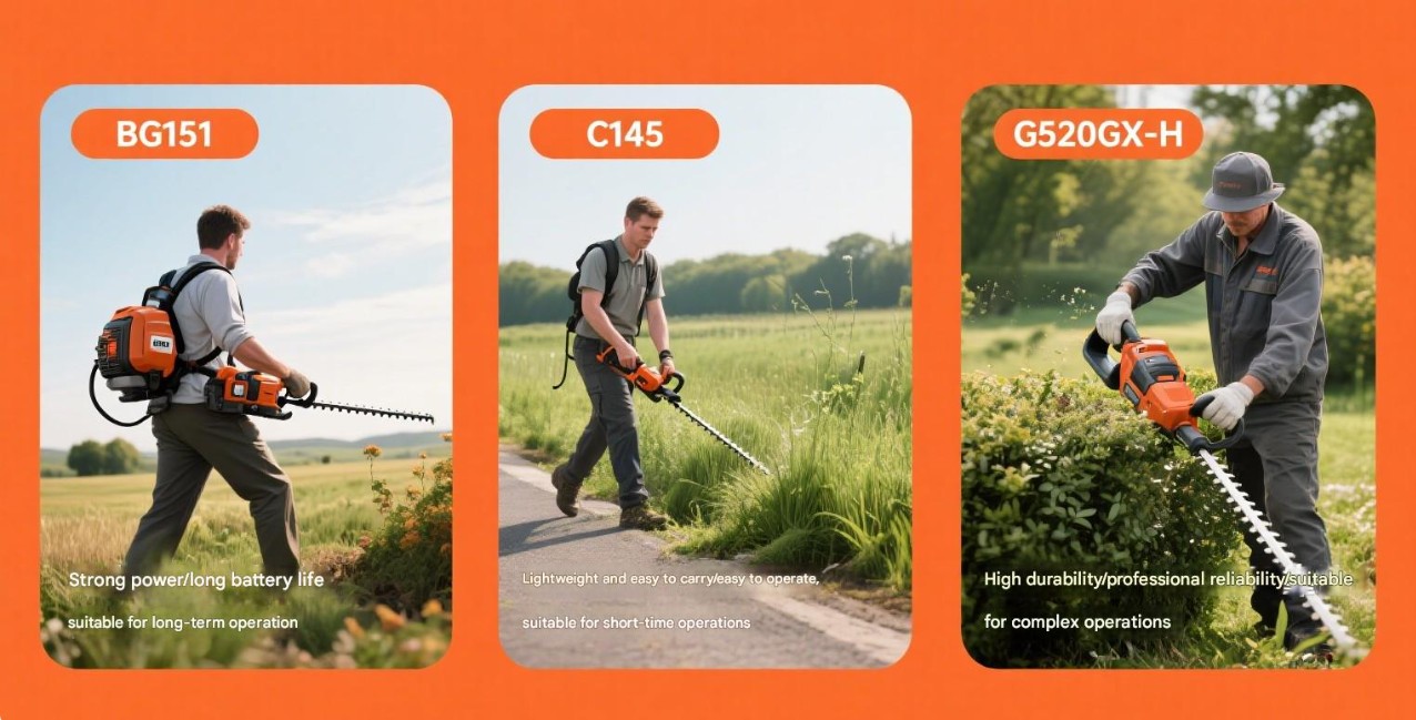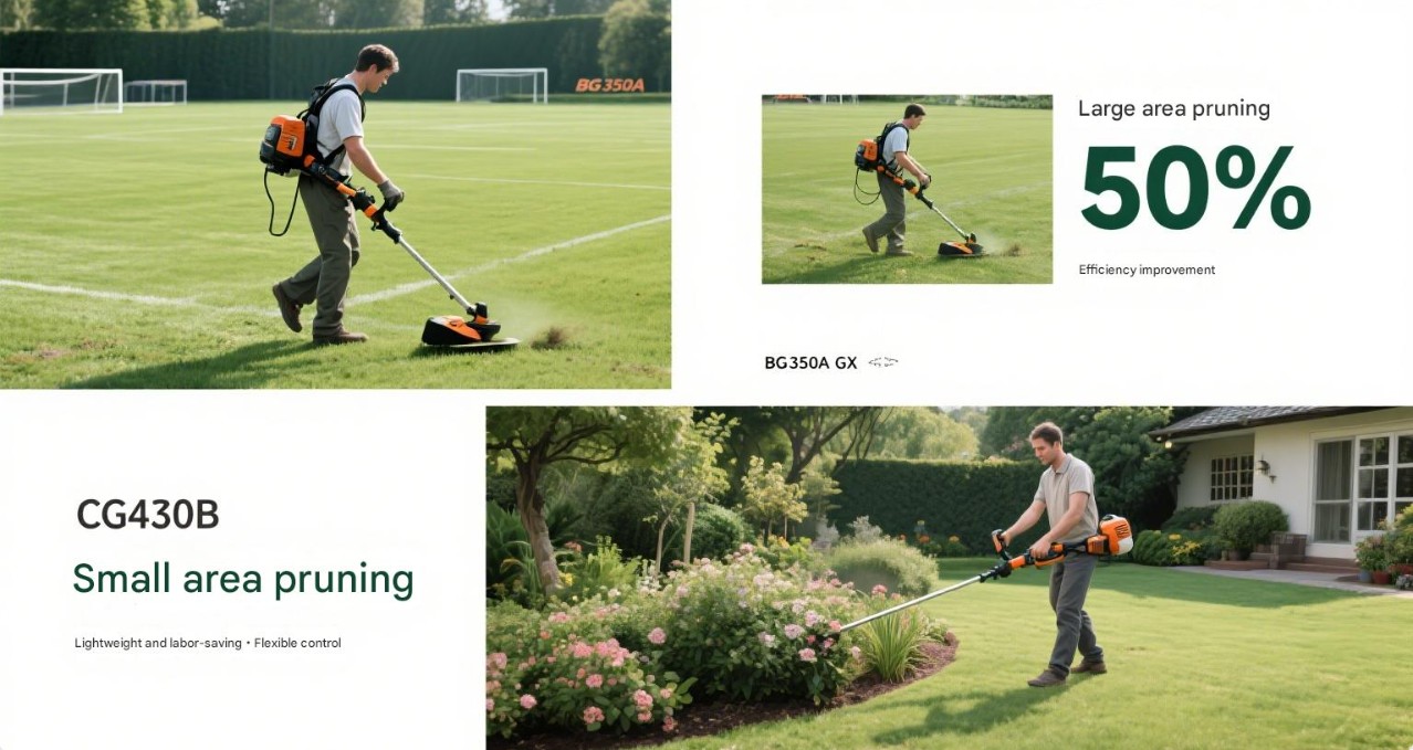 Domácí uživatelé: Pro domácí uživatele si můžete vybrat lehké a snadno přenosné kapesní sekačky, jako je CG145 Brushcutter a kartáč Cutte CG430B. Tyto modely se snadno provozují a vhodné pro domácí uživatele provádějí každodenní údržbu zahradnictví.